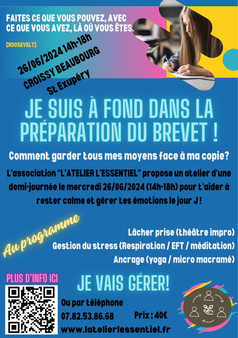 L'ATELIER L'ESSENTIEL est ravi d'annoncer notre nouvel atelier de préparation au Brevet des collèges. Cet atelier est conçu pour aider les élèves à garder leur sang froid pour ce premier examen.